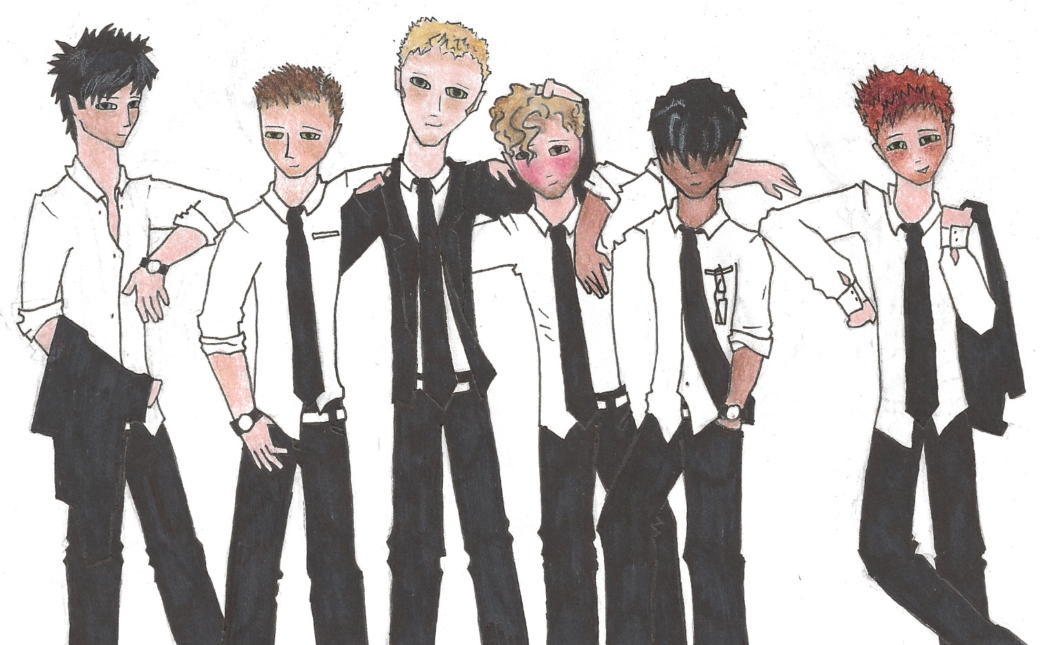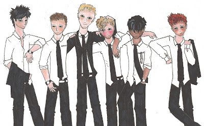 Lost here--So, here they all are. From left to right it's Gregory, Hoffernan, James, Scarlett, Houston, and Ford. On the whole they're all sweet, sensitive, smart, clever boys that just want to learn stuff and soak it all in until their brains overload and their heads blow up. This is them after an Easter mass or summat. They're all from wealthy classy Roman Catholic families in England, and they're all best friends. I am just realizing now that I forgot to colour in their belts. My apologies. Take however distracting it is to you and multiply that x10, and that's how much it's torturing ME right now. But oh well. I mean, who DOESN'T own a white belt??? Come on!