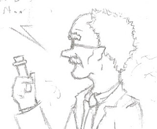 This is from the next page of my comic book that I'm making. His background story (seeing as I won't be explaining this in the comic) is that he thinks that his wife and teenaged son were killed (which they weren't) And so he's kind of crazy and he works for these horrible people that are paying him to make all of these horrible weapons. (Because he's also a scientist genius)